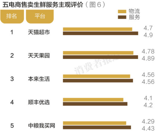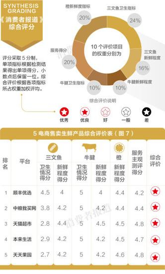 2015年10月,《消费者报道》向第三方权威检测机构送检了天猫超市、天天果园、顺丰优选、本来生活和中粮我买网的橙、牛腱和三文鱼,综合生鲜的新鲜程度、安全性、服务评价三方面进行对比,结果顺丰优选更值得购买。
