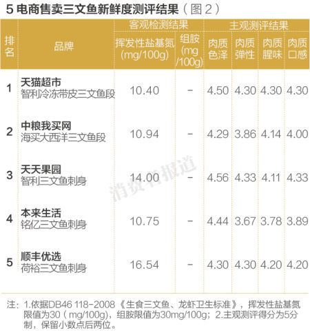 2015年10月,《消费者报道》向第三方权威机构送检了天猫超市、天天果园、本来生活、顺丰优选和中粮我买网等5家生鲜电商售卖的三文鱼,分别进行菌落总数、大肠菌群、沙门氏菌和金黄色葡萄球杆菌等安全指标的检测。