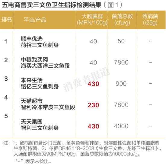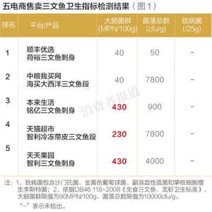 不过,在大肠菌群这一卫生指标上,3家电商的三文鱼则出现了问题。