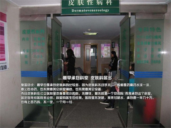 最早也是承包皮肤科的比较多。因为皮肤科不动手术,一般都是药膏药水涂一涂,要么吃点药,也不需要其它科室辅助,也不需要其它设备。而且皮肤科在公立医院里本身是很小的科,不赚钱,莆田人给的承包费一年几十万,也有上百万的,不一定,一个月一付。