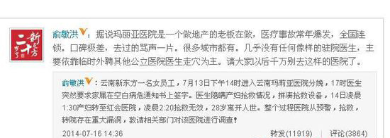 2014年7月,新东方董事长俞敏洪就在微博炮轰莆田系医院,事件导火索是新东方一位教师进入云南玛莉亚医院分娩死亡。(综合新华社《瞭望东方周刊》、中国青年报等)