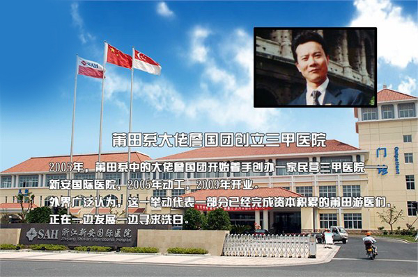 2005年,莆田系中的大佬詹国团开始着手创办一家三甲医院——新安国际医院,2005年动工。(曾被王海、媒体乃至卫生部纠风办调查、曝光乃至通报的詹国团,这位陈德良的开山弟子,在20世纪90年代末期,是东庄做得最为成功、但也被曝光最多的游医。一份名为《1998,王海杀进性病市场》的材料中称,当时以詹国团为首,詹国营、詹玉鹏、詹国连、林宗金等为骨干的莆田游医集团,是莆田游医的中坚力量。)
