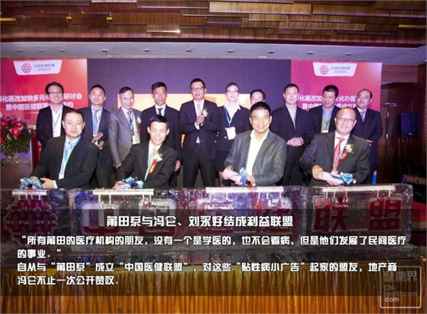 2013年,莆田系的老板们和冯仑、刘永好刚刚结成利益联盟,中国医健联盟,向健康产业地产转型。“所有莆田的医疗机构的朋友,没有一个是学医的,也不会看病,但是他们发展了民间医疗的事业。”自从与“莆田系”成立“中国医健联盟”,对这些“贴性病小广告”起家的盟友,地产商冯仑不止一次公开赞叹。