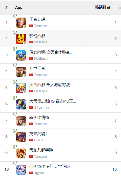 目前尚不能得出结论,从另一个观察尺度来看,来自App Annie数据显示,在畅销榜的 Top 20 里,仍是《王者荣耀》《梦幻西游》等MOBA、MMO手游的天下。考虑到畅销榜算法复杂,主要以活跃用户数、付费用户数等指标做出综合考量,更能显示游戏在当下的人气。