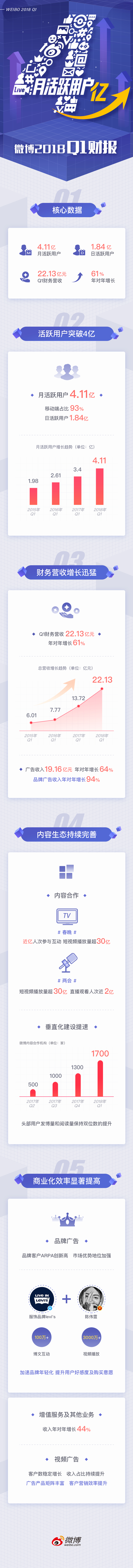 5月9日,微博发布2018年第一季度财报。财报显示,截至今年3月,微博月活跃用户数已增至4.11亿,成为全球第7家活跃用户规模突破4亿的社交产品。