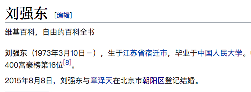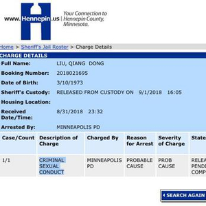 9月2日7:02分(UTC时间)被一名署名Macans的ID更改,“1974年2月14日”生日被更改为“1973年3月10日”。而Qiang Dong, Liu是在当地时间9月1日下午4时许保释出狱。目前状态为取保等待正式投诉(released pending complaint)。