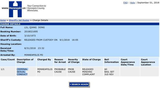 不过,根据亨内平县(Hennepin County)治安官网站记录,Qiang Dong Liu于当地时间8月31日晚间11:32分入狱,而疑犯的出生日期为1973年3月10日。