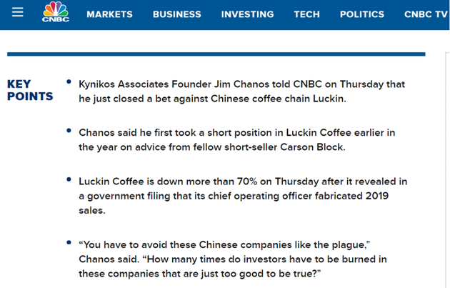 Kynikos Associates创始人吉姆·查诺斯(Jim Chanos)表示其押注了瑞幸咖啡的空头,并且号召投资者远离此类中国公司。