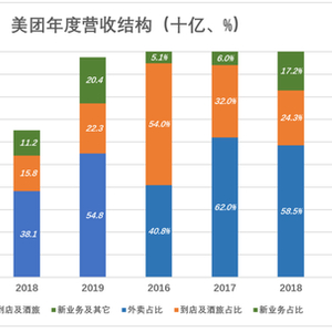 2017年,外卖业务收入210亿(其中203亿为佣金),占总营收的62%。2018年,外卖业务收入381亿(其中357亿为佣金),占总营收的58.5%。