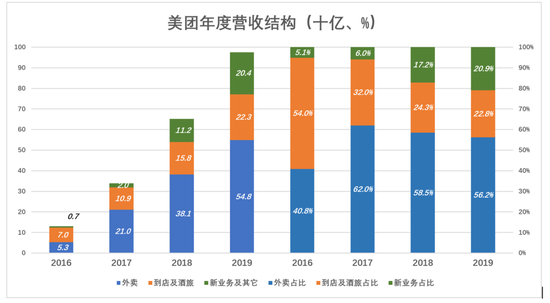 2019年,外卖业务收入548亿(其中496亿为佣金),占营收的56.2%;到店/酒旅收入223亿,占营收的22.8%;新业务及其它营收204亿,占营收的20.9%。