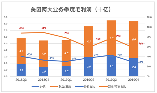 2019年Q3、Q4,到店/酒旅业务毛利润分别为55亿、56亿,占当期毛利润总额的57%、58%。