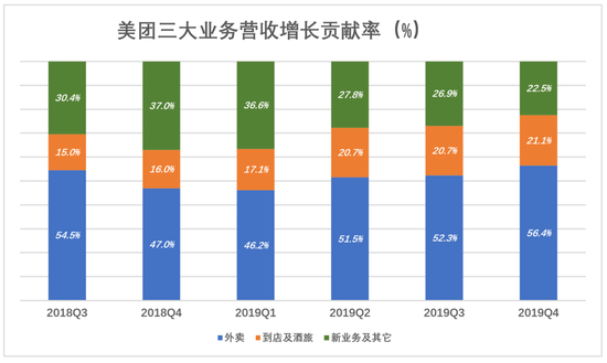 例如2019年Q4,外卖收入占营收的55.8%,对总体营收增长的贡献率为56.4%,相差不到1个百分点;到店/酒旅收入占营收的22.6%,对总体营收增长的贡献率为21.1%,相差1.5个百分点。