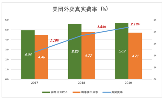不计“包邮”收费,2019年美团外卖实收佣金86亿,每单佣金0.98元,费率2.19%。