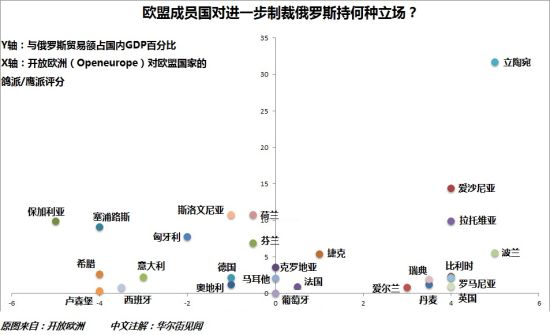 华尔街见闻本月初的文章曾用以下欧洲智库“开放欧洲”(Openeurope)的图表说明,波兰和波罗的海国家就属于以上特例,他们与俄罗斯经贸关系密切,却是推动制裁俄罗斯的力量。