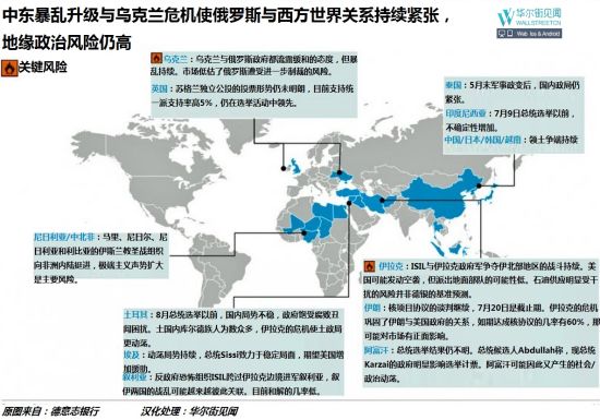 转眼将近一个月过去,全球最有可能一触即发的主要地缘政治风险并未缓和。乌克兰危机因马航客机被导弹击落更趋紧张、侵入加沙的以色列注定要与哈马斯死磕、恐怖组织ISIL还在叙利亚和伊拉克兴风作浪……本月全球多地的地缘冲突继续升级,只有哥伦比亚多年的冲突看来总算要画上句号。