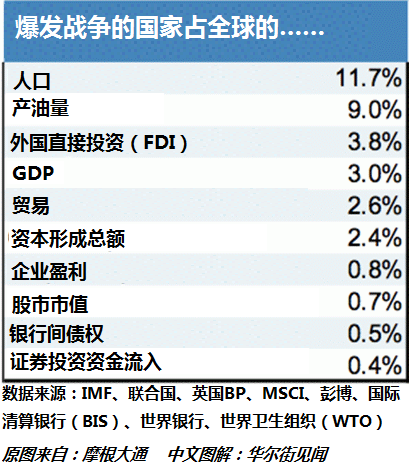 “爆发战争的国家人口占全球总人口的11.7%;产油量占全球总产量的9%;FDI合计占全球总规模的3.8%;GDP合计占全球的3%。”