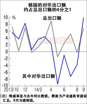 韩国经济依赖中国的风险已经表面化。韩国银行(央行)10月24日公布的7~9月国内生产总值(GDP)快报值显示,出口同比下降2.6%,创出2008年金融危机以来的最大降幅。这在很大程度上是因为,随着中国经济减速和中国企业的崛起,韩国的智能手机相关产品出口有所放缓。而在获得直接投资和旅游者消费方面,韩国依赖中国的倾向也在加强,担心过度依赖中国的观点正在扩大。