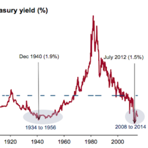 瑞信下图显示了1800年以来美国国债长期综合利率的走势,利率如此之低的情况历史上仅有两次,一次是当前,一次为大萧条结束到二战后初期的20年时间。