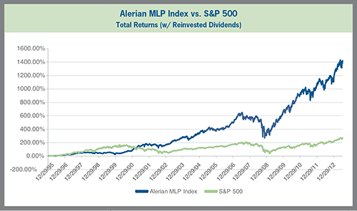上图是Alerian公司编制的MLP指数与标普500指数的走势对比。从1995年-2013年,MLP指数的表现远远超越标普500指数。
