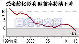 日本内阁府12月25日发布的2013年度国民经济计算确报显示,表示储蓄在家庭收入中所占比重的家庭储蓄率为﹣1.3%。从国民整体来看,以老年人为主,不少居民动用存款以高于收入的水平进行消费。此外消费税增税前抢购需求也产生了影响。储蓄率为负是自有可比较数据的1955年度以来的第一次。