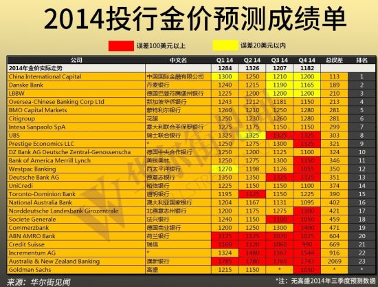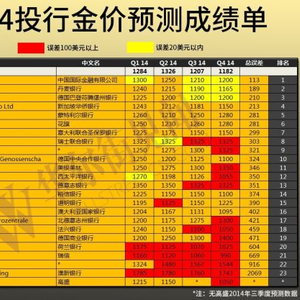 本次统计选取了2014年1月前各大机构对2014年金价的最新预测,与实际金价误差最小的机构是中国国际金融有限公司,该机构并不经常出现在黄金投资者的视野之中,但其四个季度价格有三个预测误差在20美元以内,相当不错的成绩,排名第二的德意志银行四个季度预测误差也保持在了200美元以内。