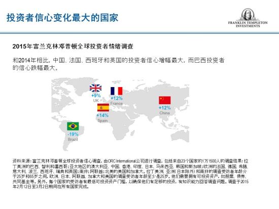 [1] 资料来源:富兰克林邓普顿全球投资者情绪调查,由ORC International公司进行调查,包括来自23个国家的1万1500人的调查结果:拉丁美洲的巴西、智利和墨西哥;亚太地区的澳大利亚、中国大陆、中国香港、印度、日本、马来西亚、韩国和新加坡;欧洲的法国、德国、希腊、意大利、波兰、西班牙、瑞典和英国;南非;阿联酋;北美的美国和加拿大。拉丁美洲、亚洲(日本除外)和南非的调查受访者年龄介于25岁和65岁之间,欧洲、日本、阿联酋、加拿大和美国的调查受访者年龄至少是25岁。他们需要拥有可投资资产,如股票、债券、共同基金等。另外,每个国家的受访者有最低可投资资产门槛,以确保他们有足够的投资,有知识能力回答调查问题。调查于2015年2月12日至3月2日期间在所有国家完成。