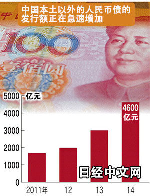根据环球银行金融电信协会的统计,人民币在全球结算货币中所占比例截至4月底为2.1%,与3年前的0.3%相比呈急剧增长势头,正在迫近占2.7%的日元。香港的点心债、新加的狮城债等人民币债券的发行余额在2014年达到4600亿元,为上年的1.5倍。