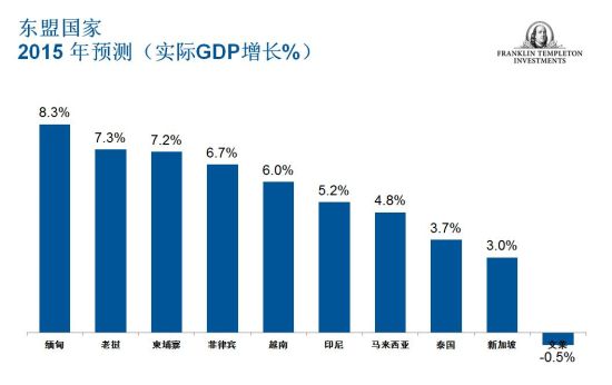 根据各个不同的预测,该地区未来的国内生产总值(GDP)增长前景远远超过发达市场,甚至将超过其它新兴市场地区。2015年新兴亚洲地区的GDP增长预计为平均6.6%,而前沿市场(frontier market)如缅甸、柬埔寨和老挝,增速预计甚至更快。[4] 而在另一端,文莱预计将萎缩0.5%,泰国和新加坡预计仍将分别保持3.7%和3%的合理增速。[5]