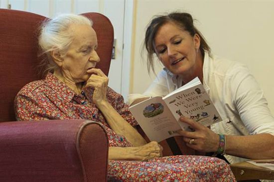 英国埃文河畔斯特拉特福的一家养老院,志愿者为患有老年痴呆症的老人读书。