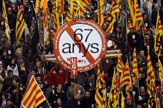 在西班牙马德里,大批抗议者参加反对延长法定退休年龄的示威活动。