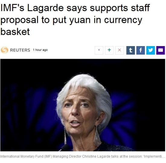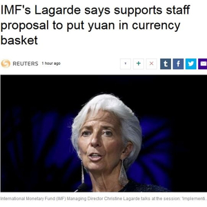 新浪美股讯 北京时间14日国际货币基金组织( IMF)总裁拉加德周五表示,IMF工作人员认为人民币满足了“可广泛使用”货币的要求,因而应该成为继美元、欧元、英镑和日元之后加入特别取款权(SDR)货币篮子的第五种货币。