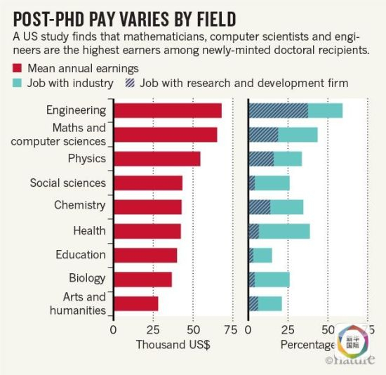 美国纽约大学等机构研究人员近日在《科学》杂志上报告说,调查了2009到2011年间毕业的3000多名美国博士的情况,并从博士毕业一年后工资水平的角度在不同专业间进行了比较。