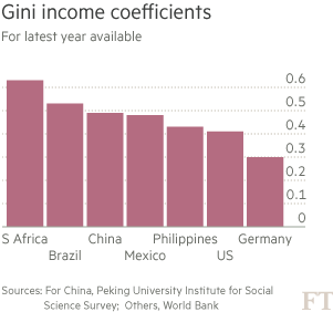 该报告称,2012年中国的基尼系数(Gini coefficient,一种广泛使用的不平等衡量标准)为0.49。世界银行(World Bank)认为,基尼系数高于0.40代表着严重的收入不平等。在世行追踪基尼系数的全球25个人口大国中,只有南非和巴西的基尼系数更高,分别为0.63和0.53。美国的基尼系数是0.41,而德国的基尼系数是0.3。