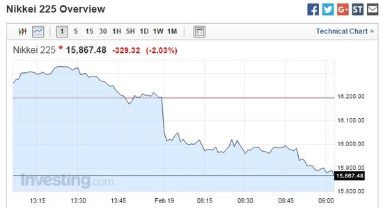 新浪美股讯 北京时间19日上午消息 日本股市日经225指数早盘走低,现跌幅达2.03%,报15,867.48点。该指数今日低开0.9%。