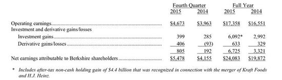 当地时间2月27日,伯克希尔哈撒韦公司公布了2015年的业绩,下面是一些主要信息。