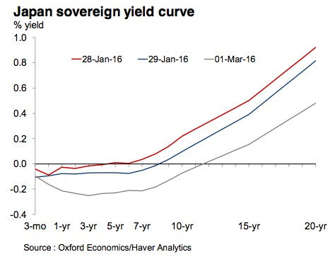 自从日本央行宣布实行负利率政策以来,收益率曲线变得更为平坦。例如上个月,20年期国债和10年期国债的收益率利差收窄了15个基点,10年期国债和2年期国债收益率利差收窄了10个基点。