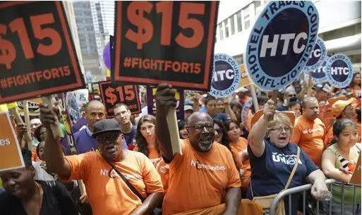31日,加州参议会以26票对12票通过立法,未来6年内,加州会逐步将最低时薪的标准提升为每小时15元。纽约州也在上周五通过法案,将最低工资逐步涨至15美金每小时。周一,纽约州长库莫签署法案时,民主党总统候选人希拉里也在场,称这是对纽约来说很棒的一天,并预测这一举动将会扩展到全国。
