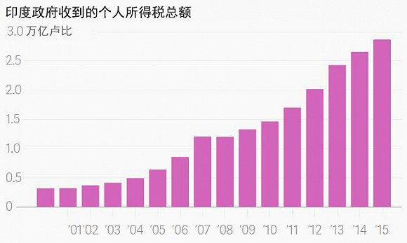税务部门称,2012-2013财年居民直接缴纳的个人所得税为2.01万亿卢比。两年后的数据有所好转,2014-2015财年居民直接缴纳的个人所得税增至2.65万亿卢比。不过,这仍只占印度国民生产总值的大约2.4%。