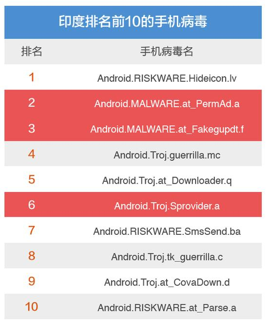 印度是悍马病毒感染量最高的国家,在印度肆虐的十大手机病毒中,第2、3名是悍马病毒家族成员,第6名是悍马病毒推广安装的其他病毒。