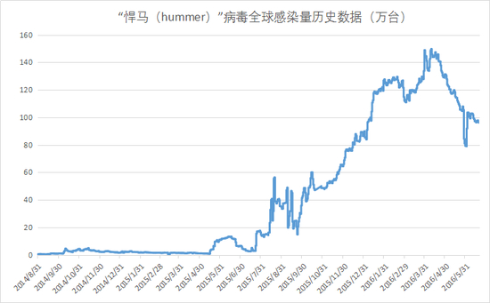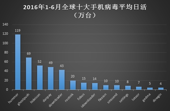 据猎豹移动安全实验室监测数据,2016年1-6月,悍马(Hummer)病毒平均日活119万,超过其他所有手机病毒的感染量。