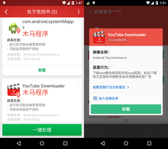 这些病毒自带ROOT模块,最新变种拥有18套不同的ROOT方案,一旦手机被感染,病毒即获得最高系统权限,因而一般的毒查杀方法均不能彻底清除。
