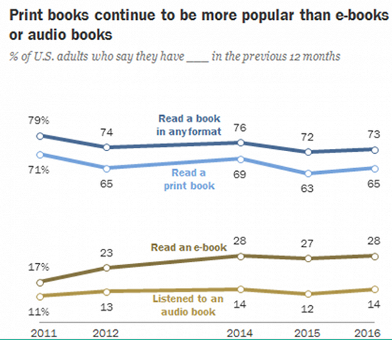 皮尤研究所于上周发布了年度美国人读书习惯调查报告。报告称在过去12个月里,有73%的美国人至少看了一本书,有65%读过一本纸质书。相比之下,只有28%的人看过一本电子书,14%的人选择听有声读物。