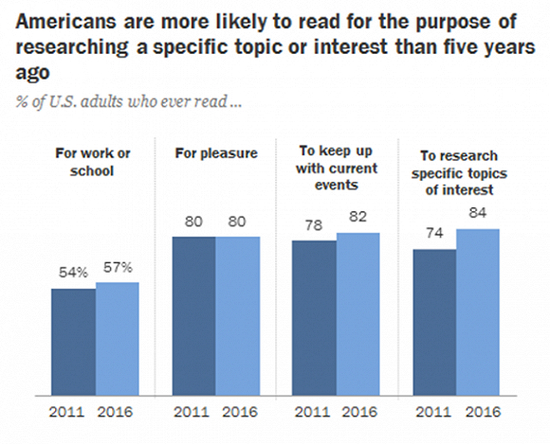 报告称,用平板电脑读书的人从2011年的4%上升到了2016年的15%;用手机的读者则从5%上升到了13%。