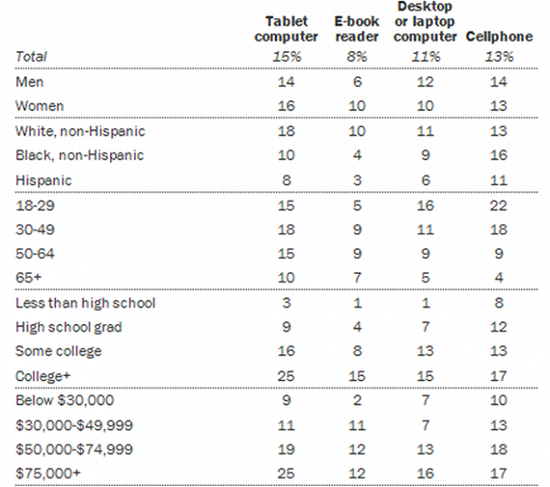 报告还显示,在电子书读者中,18岁到29岁的年轻人、非洲裔和拉美裔、未接受大学教育的读者更多使用手机而非平板电脑来看书。
