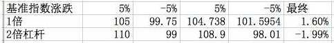 刚才说的是涨的情况,其实对杠杆ETF来说,下跌趋势明显的指数下也是好的情况,因为操作上你只要将正向ETF持有的尽快抛掉,或购入反向做空的杠杆ETF。但是,如上面计算的第三种情况,就比较复杂了,那就是一种趋势不明朗的情况,其实很多时候,我们都会碰到这种情况,对于未带杠杆的情况下,就是横盘的效果,你金钱上损失不大,损失的更多是机会成本,但持有者等待机会也是可以的。但这个时候,对于杠杆ETF就是另一种情况了,因为在这种情况下,你很可能不但损失了时间,还有切实的经济损失,即所谓的“时间损耗”。