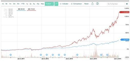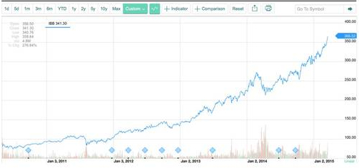所以,对杠杆类ETF,从持有角度看,必须要选择在对应的指数连续上涨趋势非常明朗的情况下,你才能获得丰厚收益。也就是说,连续的十几个甚至几十个交易日,对应指数虽然时不时跌几下,但指数整体向上,毫不拖泥带水,那么你常常就可以获得比单日杠杆倍数更大的累积收益。事实上,这种情况不多见,通常出现在牛市或一些板块的牛市,比如看看挂钩纳斯达克指数的IBB在2010年5月到2015年3月20日的走势: