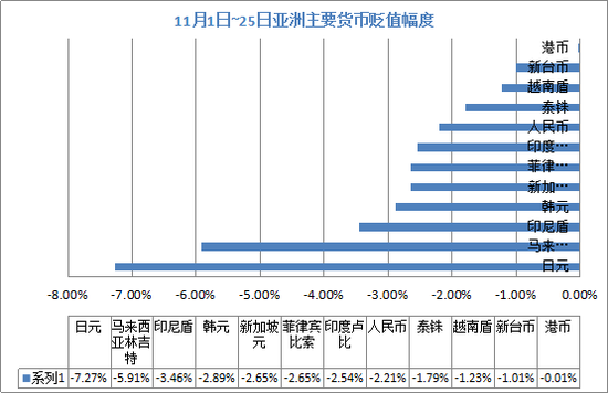 ▲自今年11月1日起至北京时间11月25日19:00左右,全球主要货币兑美元贬值幅度