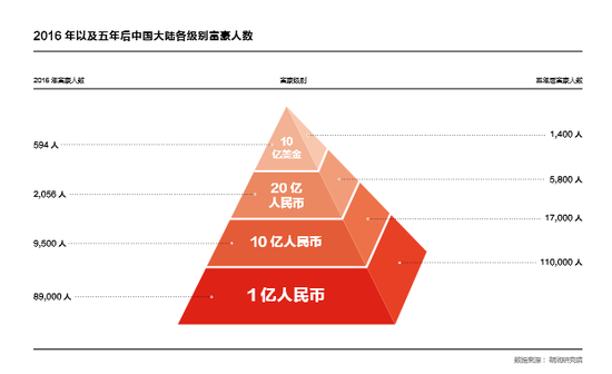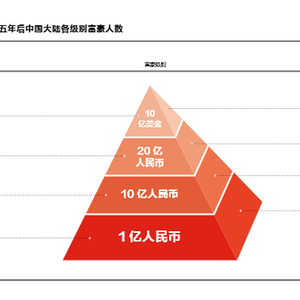 胡润研究院还预测了五年后各级别富豪的人数,五年后,中国大陆将有11万名亿万富豪,17000 名十亿富豪,5800 名富豪的 资产将达到二十亿 ;十亿美金富豪的人数将增至1400人,加上隐形富豪的话,中国大陆将有4200名十亿美金富豪。