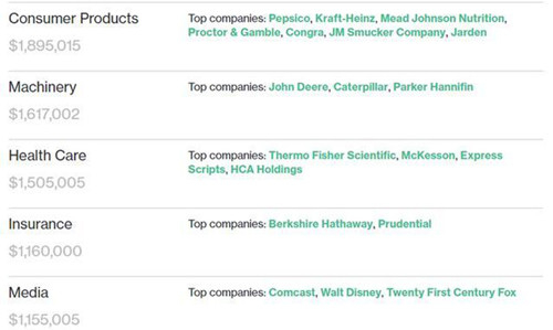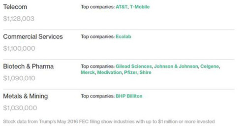 以下为彭博社统计资料,解释了特朗普在各个领域和公司所持的股份: