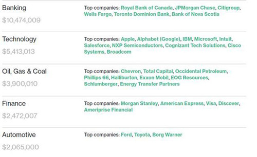 据彭博社预测,特朗普今后可以从他的一些政策提议中受益,如较弱的金融监管或是石油和天然气发展等领域。数据显示,特朗普共拥有3800万美元股票。